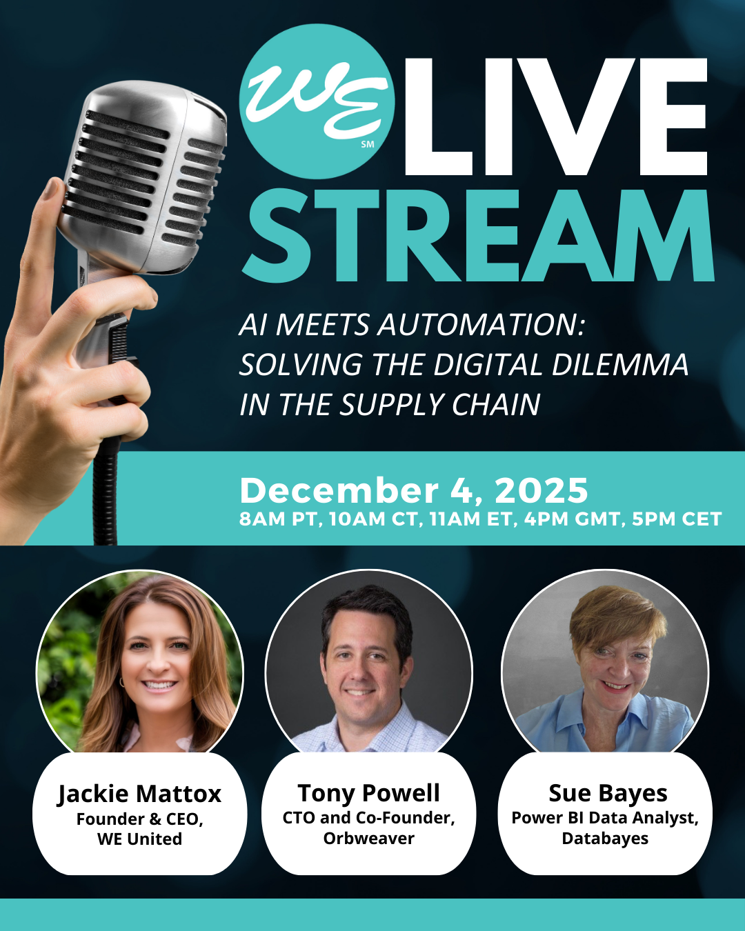 Join us this Thursday for a live discussion regarding the real role AI plays in today’s supply chain. Several WE United Chapters are hosting local watch parties and will continue the conversation in person. Join the crowd!
