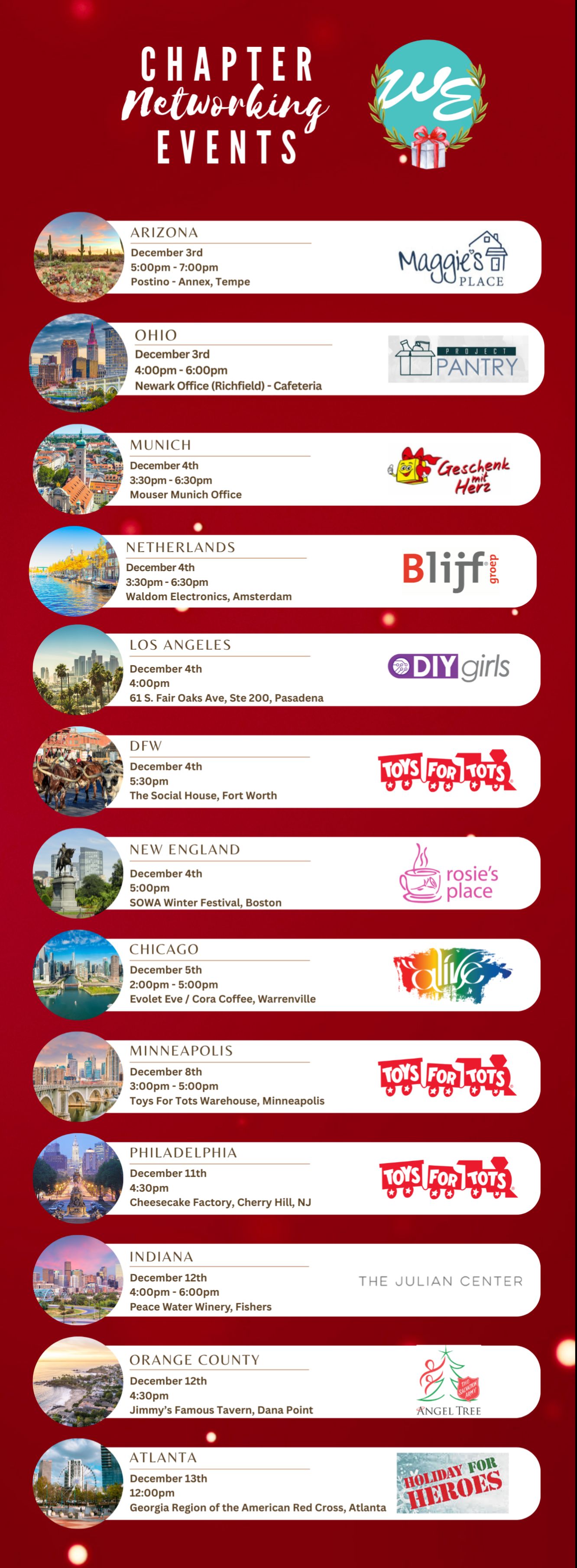 December kicks off a full month of chapter events across the globe! Whether you’re joining from your hometown or traveling for the holidays, connect with WE members, expand your network, and give back to local communities.